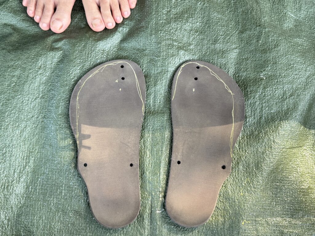 - ソール(サンダル底)を自分の足の形を元にして作ります。希望者は、滑り止めゴムを追加(無料)で貼ることもできます。